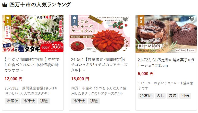 四万十市のふるさと納税でおすすめの返礼品第1位は「カツオの塩タタキセット 400g→500g」です。新鮮なカツオを使用し、塩で味付けされたタタキは、四万十市の海の幸を堪能できる逸品です。第2位は「イチゴのレアチーズタルト」で、地元産のイチゴをふんだんに使ったスイーツは、甘さと酸味のバランスが絶妙です。