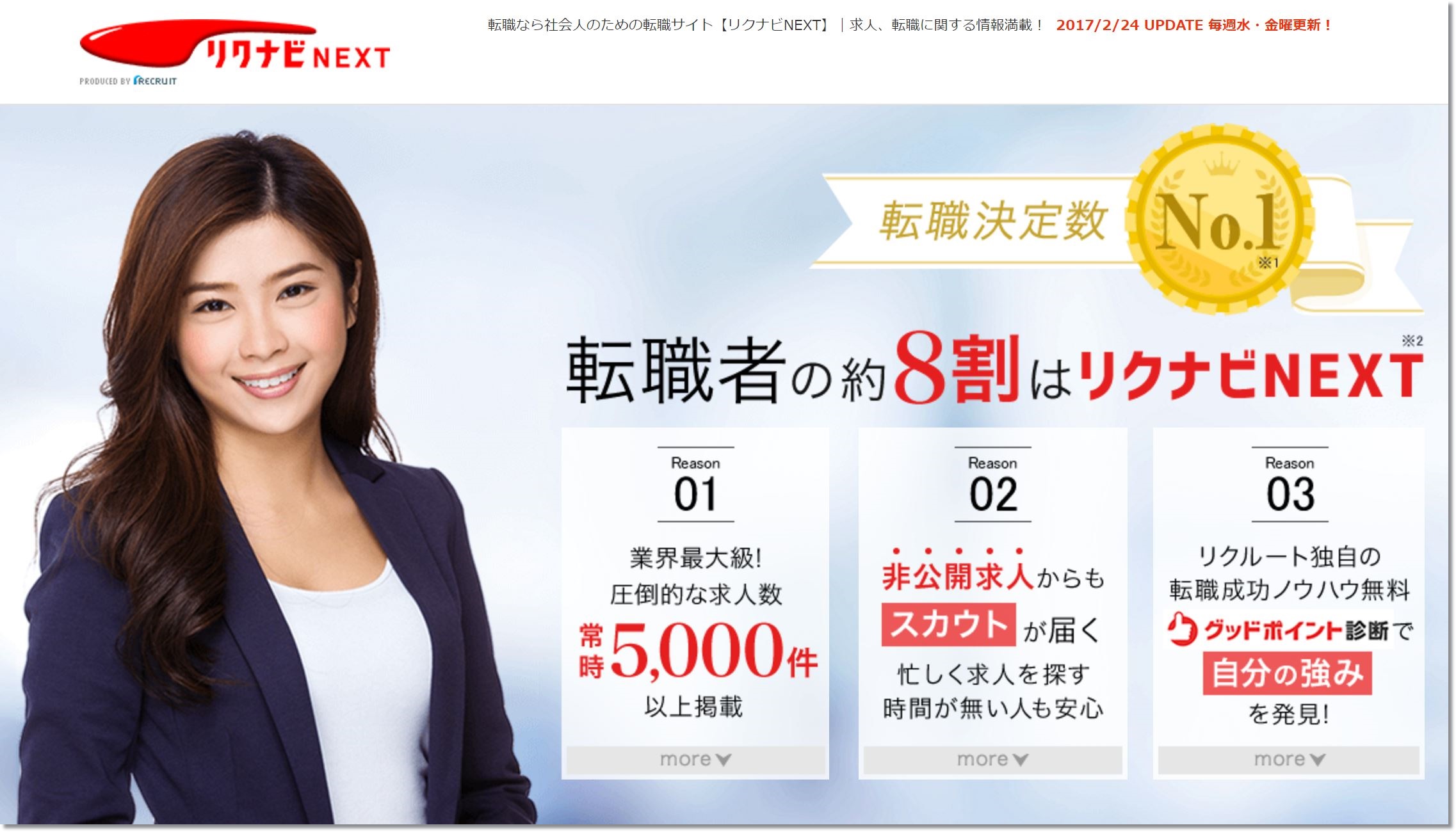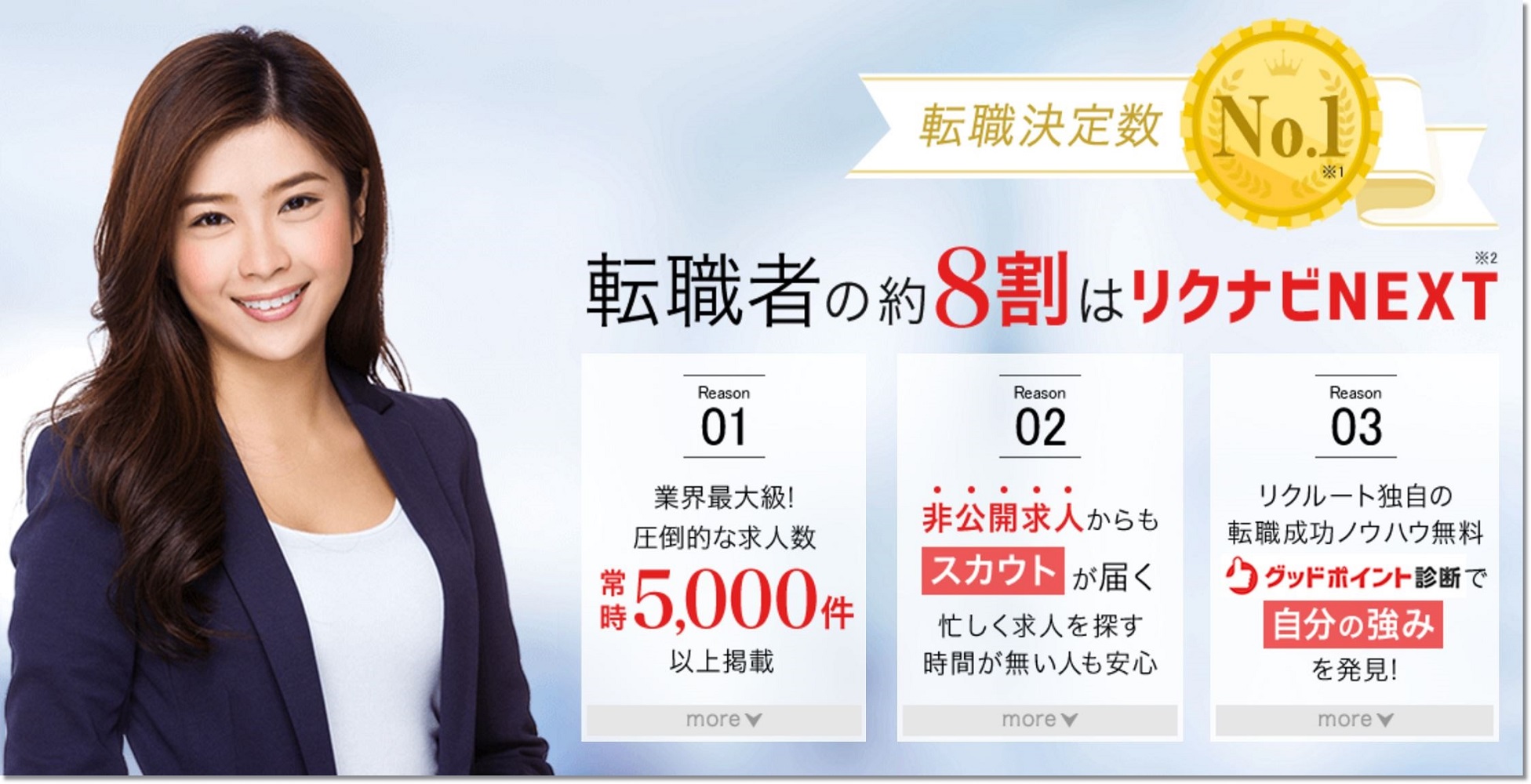 まずはランキングNo1のリクナビNEXT、転職エージェントであればリクナビエージェントから始めてみましょう。