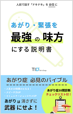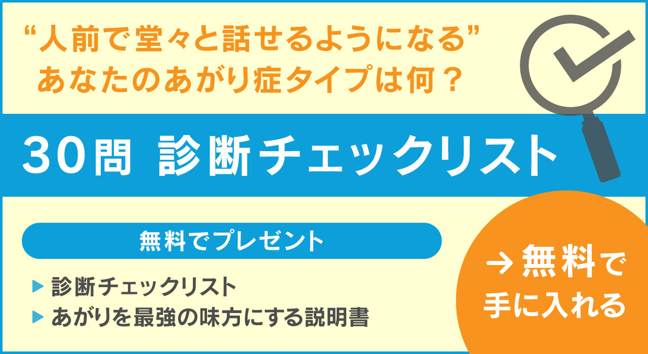 あがり症を味方にする電子ガイドブックを期間限定で無料配布中。朝礼中、緊張・あがってしまい「上手く話せない…」「声が震えてしまう…」「手足が震える…」そんな悩みの解決をする、 【あがりや緊張を最強の味方にする方法】を一挙大公開!あがり症のタイプが分かる30問の診断チェックリストも付いてますので、現状のあがりの状態も客観的に分析することもできますよ。