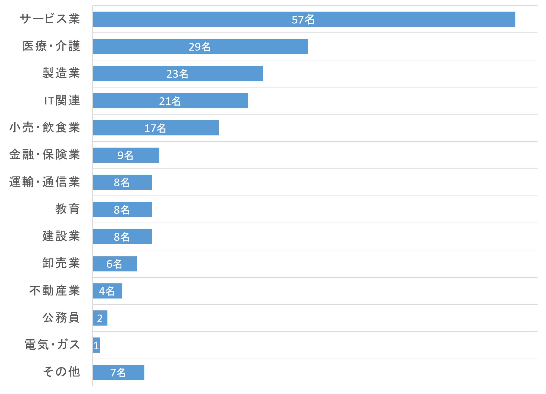 業種ですが1番多いのがサービス業、続いて医療・介護、製造業、IT関連という流れに。
