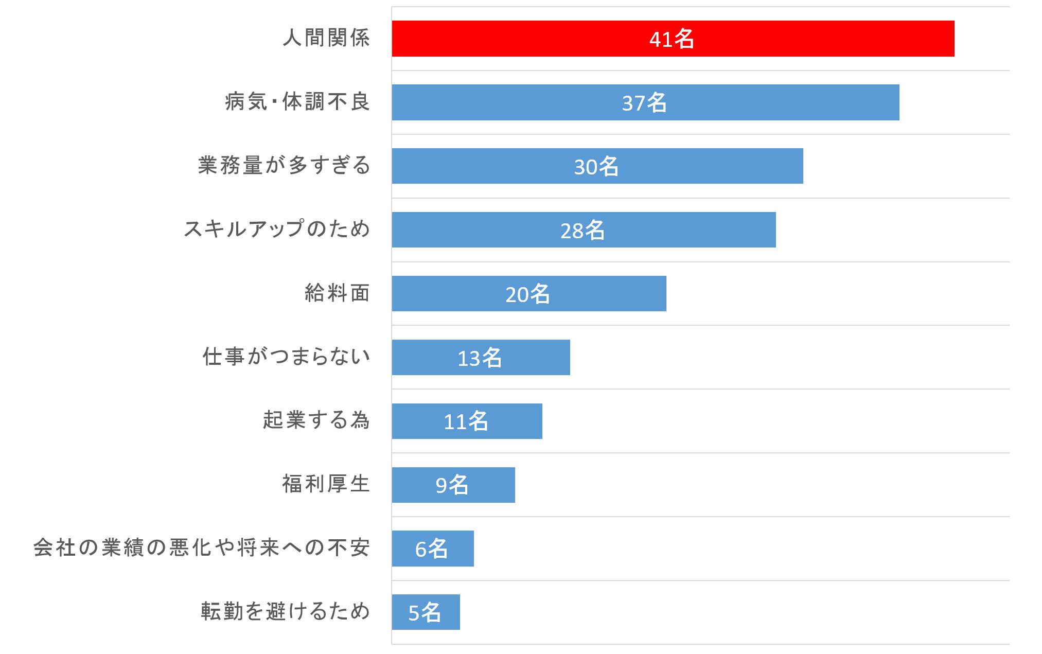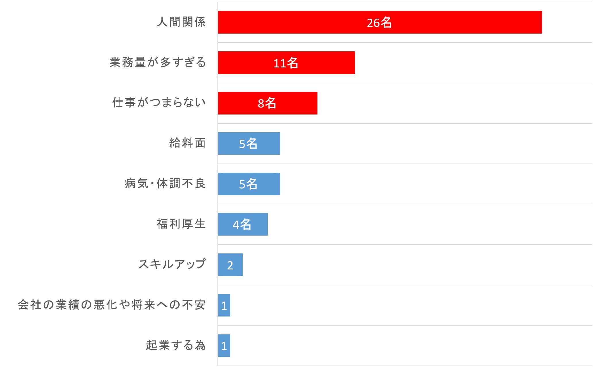 その中でも人間関係・体調面・業務量の多さが原因で退職を決めてる人で半数近くを占めていました。