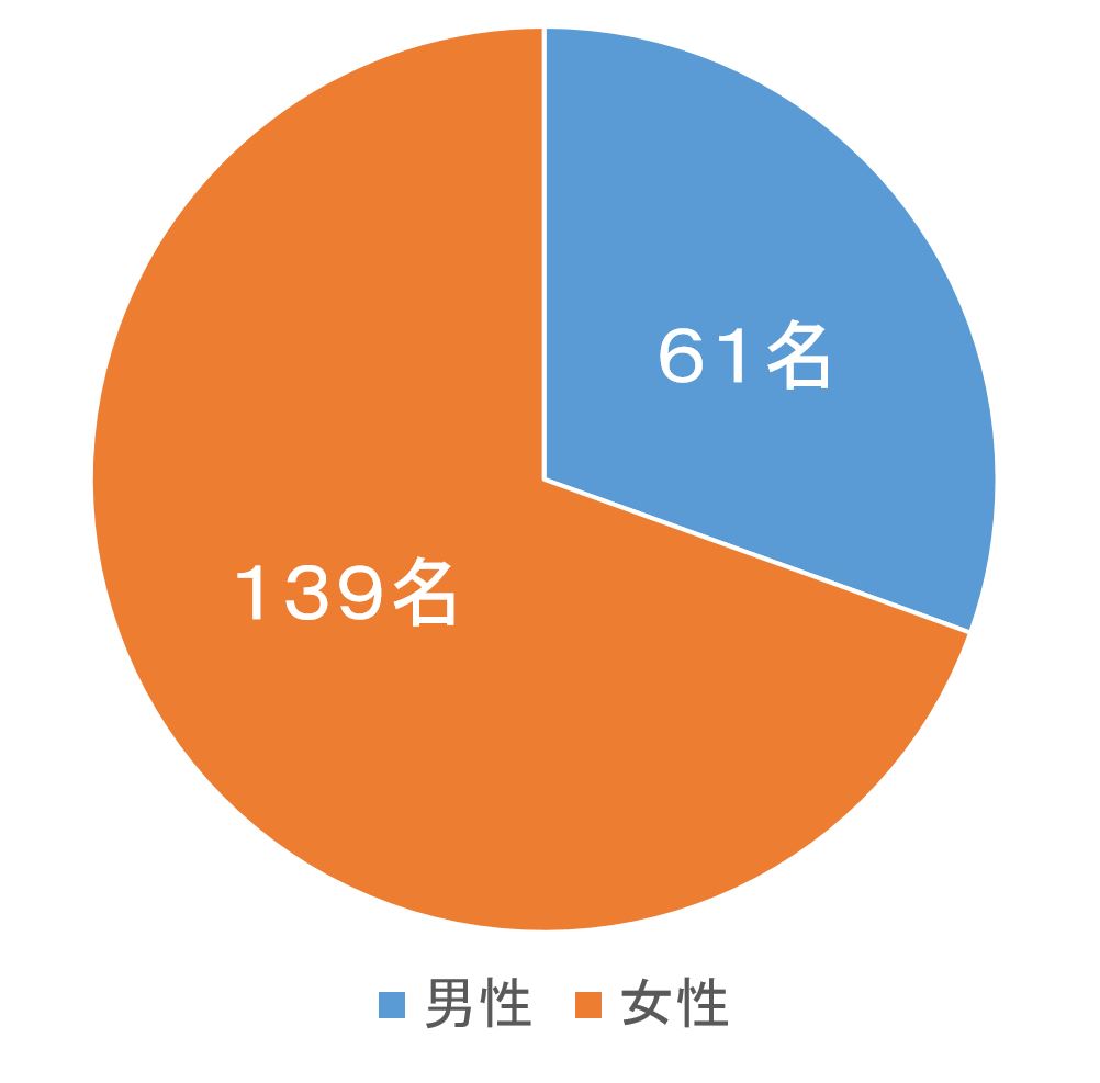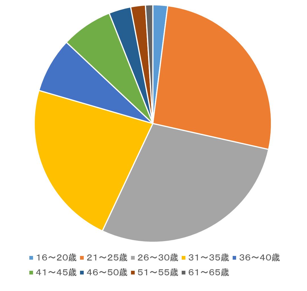 年齢は20代~30代前半の人が多く77%の割合の人が、こちらの年代に該当してます。