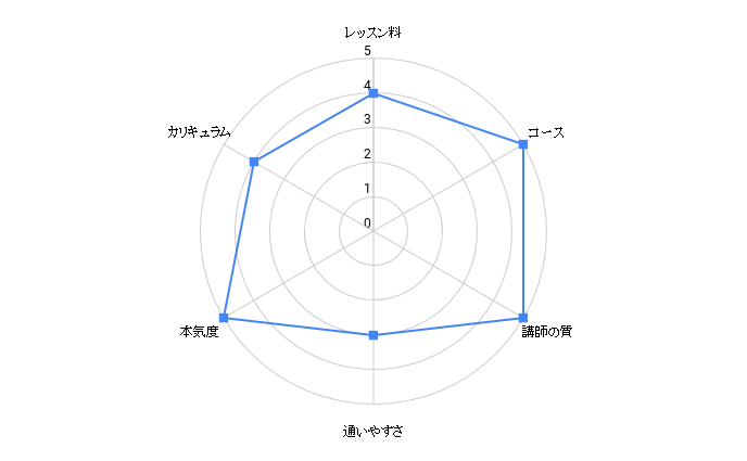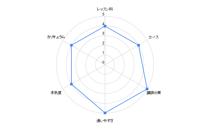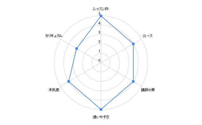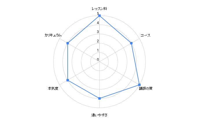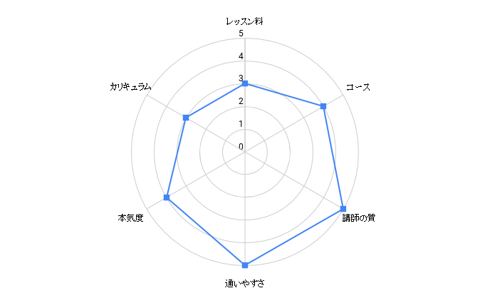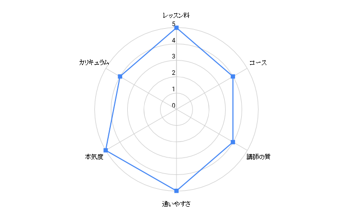 | レッスンの予約の利便性 | ★★★★★ | ★★★★★ | ★★★★★ | ★★★★★ | ★★★★☆ | ★★★★☆ | ★★★★☆ | ★★★☆☆ | ★★★★☆ | ★★★★☆ | ★★★☆☆ | ★★★☆☆ | ★★★☆☆ | ★★★★☆ | ★★★☆☆ |